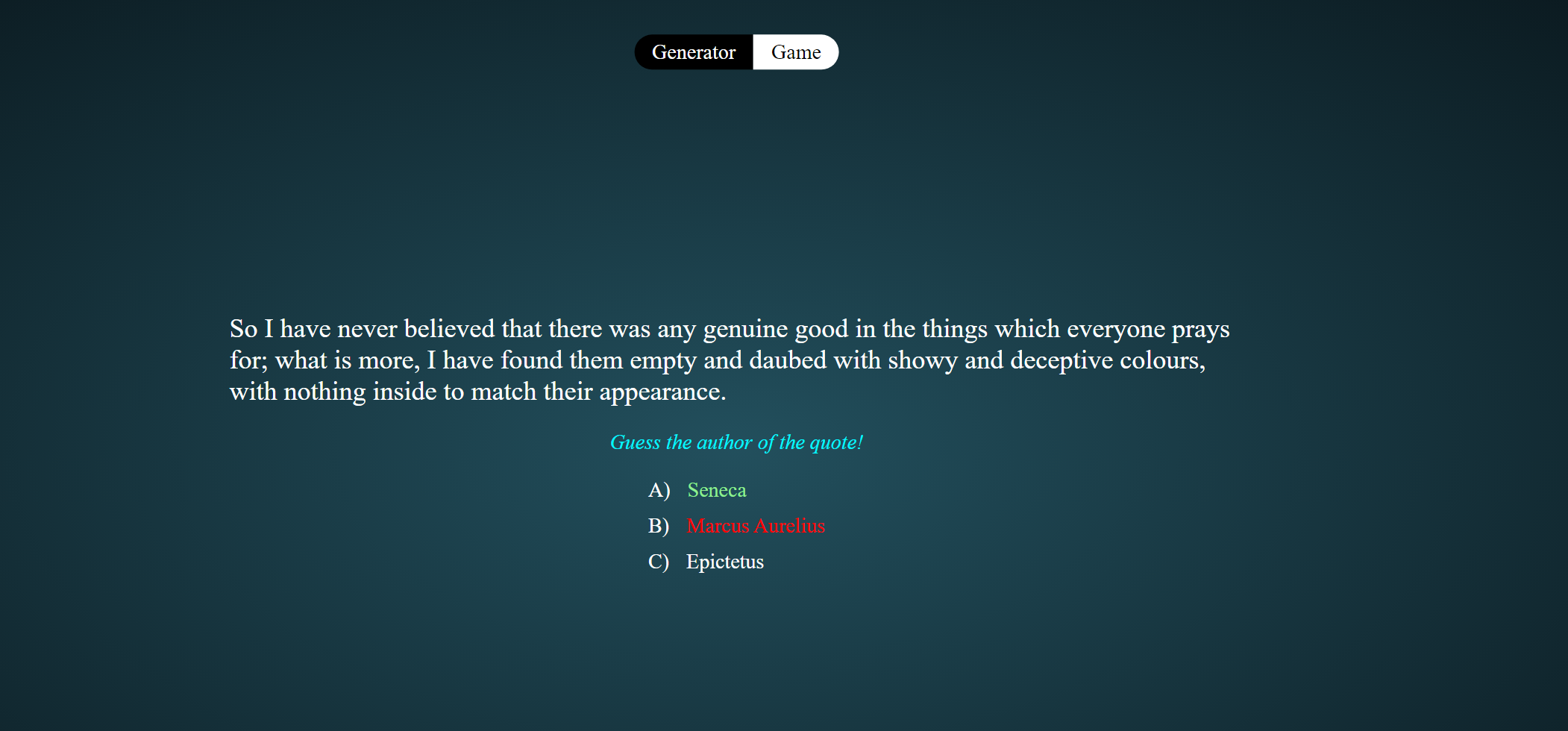Uses a stoic quote API to generate and display a quote and it's author. User can toggle between modes, generator or game. The game consists of guessing the correct author of the given quote.